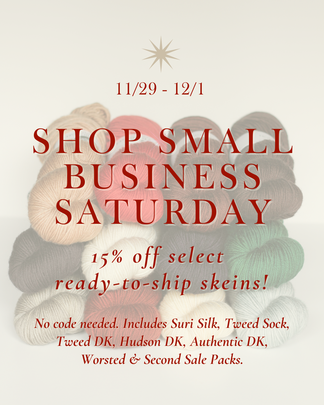 Small Business Saturday is almost here, and we're celebrating with 15% off select ready-to-ship yarns from November 29th through December 1st as a way to say thank you for supporting this small business. No code needed. You’ll find favorites like Suri Silk, Tweed Sock, Tweed DK, Hudson DK, Authentic DK, Worsted, and Second Sale packs. Think of it as a little yarn-filled sparkle to kick off the season.